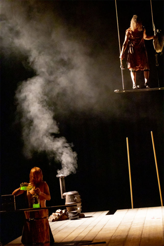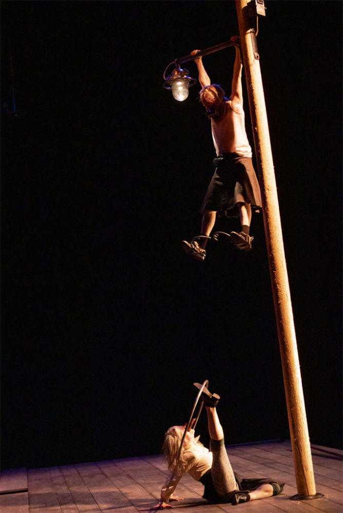De la recherche sur la monstruosité cher au cirque traditionnel – monstres et corps assemblés – à la danse, la manipulation d’outils, la magie, les expériences chimiques, le chant et le trapèze Washington, ils trouvent une manière de danser à deux, de vivre dans le même espace et inventent ainsi un monde chimérique à eux deux où tout ce qui est étranger semble logique et cohérent, comme dans un rêve.