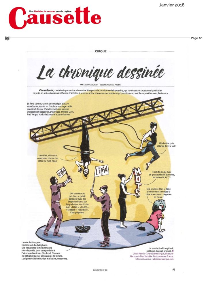 Maroussia Diaz Verbèke compose un troisième cirque, inventif, saisissant et festif. Une collection passionnée de mille sujets et pensées existentielles viennent tour à tour dans le cercle, figurer au propre, la marche littérale- ment au plafond, le saut intrépide de la mort, l’incroyable jeu de mots, le rire renversant, la voltige de l’enthousiasme, l’équilibre d’aplomb et autres exercices initiatiques de notre existence kaléidoscopique. Qui, puisqu’on en parle, et tant qu’on en parle, sera célébrée par une fête en forme de Dj-set. Youplaboum.