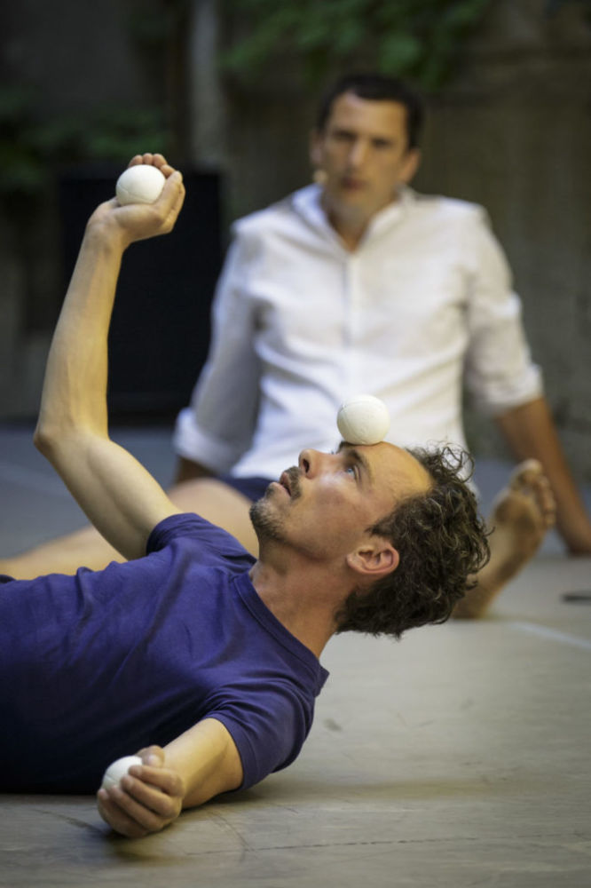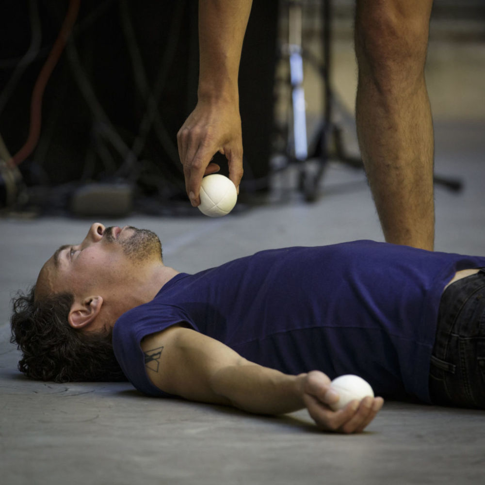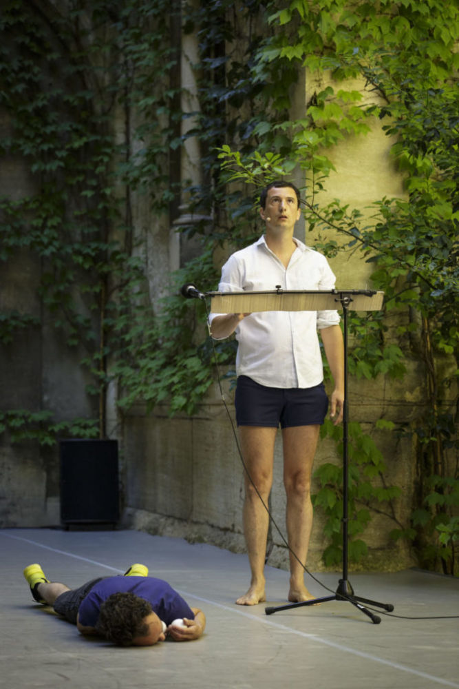 Disons les choses : on ne se connait pas. On a reçu un coup de fil fin mars : il y a une cour, avec un plateau, on pourra faire un spectacle dedans. On commencera à l’écrire ensemble, mi-juin. La contrainte liée au dispositif nous plaît. Après tout, on pourrait tout à fait imaginer que ce soit statutaire, dans le spectacle vivant, d’avoir peu de temps et pas d’intention initiale. On fera de notre mieux.