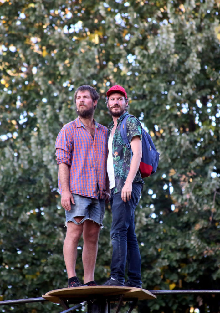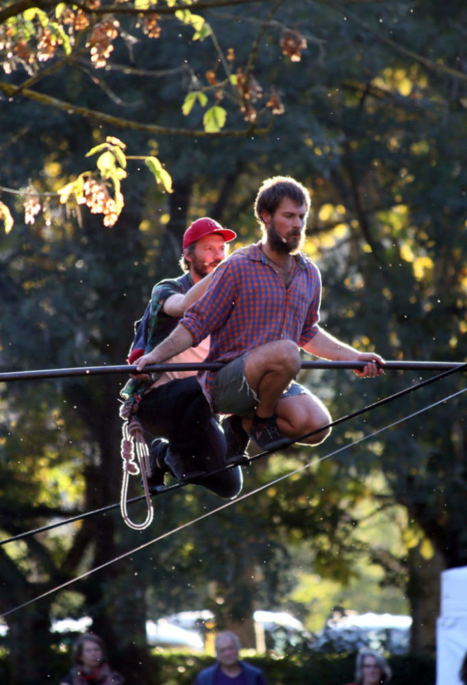 Au niveau de la mer, ça s’amasse. S’agglutine. On est de plus en plus. Ça se réchauffe. On fait un feu. On raconte. Notre nuit sous tente, nos projets d’avenir proche, notre passé et nos ambitions loupées. Faut pas rester planté là. Les langues se délient. Une musique. Un chant pour se rappeler qu’on est d’ici. C’est l’heure pour les deux. Ils s’équipent. 30m de câble et 10m de haut s’étalent devant. Un balancier pour deux. 9m de long et 17kg d’acier trempé suffiront.